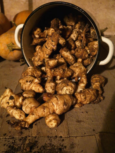 Jerusalem artichokes (above) can be left in the ground all through the winter and if you leave a foot (300mm) of the stalks on you can locate the plants even if there has been snow. These tubers look similar to ginger and are said to make you pass wind but in my experience they don’t have this effect. I read they are good when deep fried but I didn’t like them that way, they were too soft and sloppy. Boil them for about 5 to 10 minutes (depending on the size – until half cooked), drain the water and return to the pan with a nob of butter and some lemon juice and cook for a few minutes. Remove from the heat and mix in some single cream. Cooked like this they are tasty, although my my girlfriend still doesn’t like them! I suppose it’s a matter of taste.